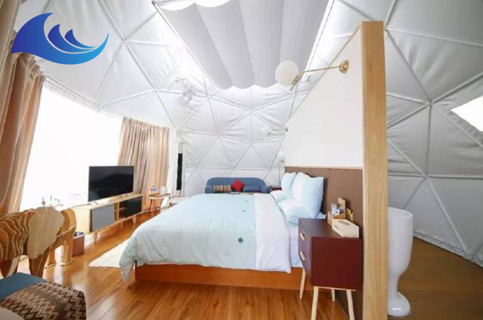 帳篷酒店采用高強(qiáng)度中空鋁合金結(jié)構(gòu)或者是鋼結(jié)構(gòu),表面具備有防腐處理,優(yōu)選膜結(jié)構(gòu)頂棚,安全耐用,防水、阻燃、防紫外線(xiàn)。
